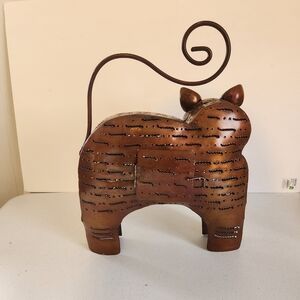 Vintage Folk art Fat Cat Cut Out Bronze Painted Metal Lantern Candle Holder Boho