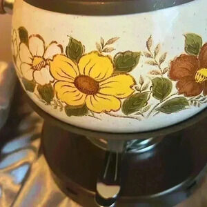 Vintage Fondue Pot with nice wood handle enamelware fondue pot with lid. Comes with metal rack and burners. Very Good Vintage condition. Small paint chip on lid