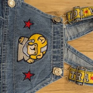 Stylish kids denim overalls featuring fun sports patches. Perfect for active play and casual outings.