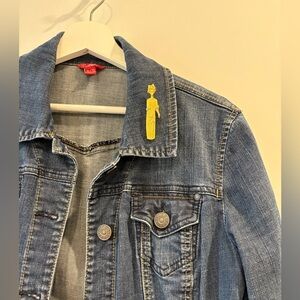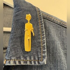 This is a beautiful and unique vintage brooch from the renowned Quebec artist, Fortin. Dated 1999, this piece features a stylized gold-tone figure of a lady holding an umbrella.