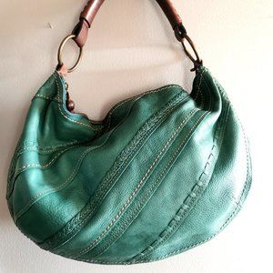 Vintage Fossil Teal Patchwork Boho Leather Shoulder Bag with Leather Tassel