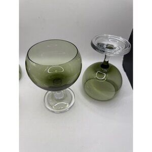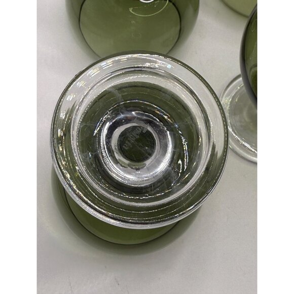 Bring a touch of 1970s sophistication to your table with this elegant Fostoria “Sphere Green” stemware set, produced only between 1971 and 1972 and now discontinued. These mid-century glasses feature a distinctive olive green bowl with a clear stem and base, a signature look of the Sphere pattern. Each piece is etched “Fostoria” on the base and showcases the brand’s hallmark craftsmanship and clarity.