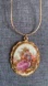 Vintage Fragonard porcelain cameo pendant featuring a courting couple. (The listing includes the free 24” chain shown) The pendant is set in a gold-tone metal frame with a twisted rope design. The pendant depicts a scene reminiscent of the work of French Rococo painter Jean-Honoré Fragonard, known for his romantic and idyllic scenes. The back of the pendant is plain. The pendant is in excellent condition.