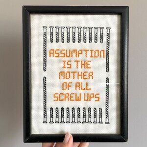 Handmade, cross stitch of a cheeky quote, "Assumption is the mother of all screw ups" surrounded by a bunch of screws. Framed to be place on a ledge/workshop table.