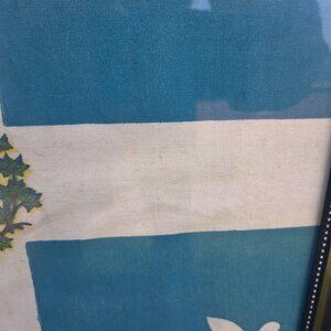 An old framed Catholic processional flag that I was told is from the 1950s. It is the "Carillon Sacre Coeur" type, celebrating both the sacred heart and Quebec (a version of the flag less the sacred heart has been the official flag of Quebec as of 1948); it was originally created by a priest in 1902. This flag does have some wear as in the photos.