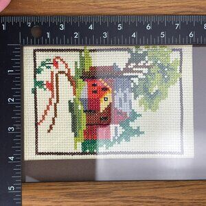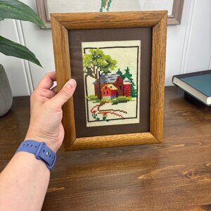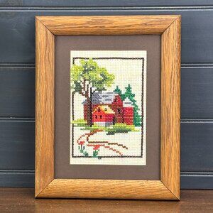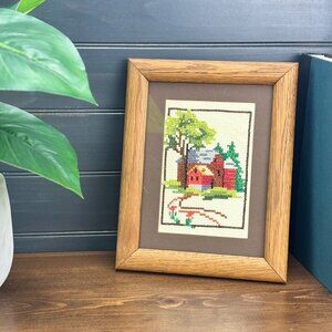 Vintage Framed Cross Stitch Country House or Red Barn in Solid Oak Wood Frame