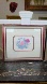This piece features a beautiful color print of a botanical bouquet, showcasing a lovely pink rose, a vibrant magenta carnation, a white rose, and other delicate blue and white blossoms. The print is professionally presented under glass and is double-matted with a dark maroon inner mat and a textured, parchment-style cream outer mat.