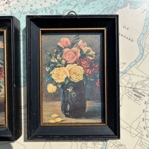 Vintage set of two framed mini floral prints. Roses and Carnations, both frames are somewhat distressed / show wear, see photos for details. Each piece measures approximately. 6" x 4.25".