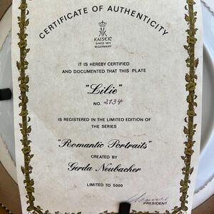 Lovely wooden framed collectible plate! Vintage Kaiser 'Lilie' limited edition of the Romantic Portrait series by Greta Neubacher. This 10 inch plate is framed in wood, protected by glass and is ready to hang. The frame is brown with gold trim accents that do justice to the beauty of the plate. Framed, it measures 14.5 inches tall & wide and 2 inches deep. Scratch/mark free and from a smoke free home. Certificate of authenticity included.
