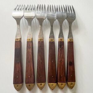 Vintage France Stainless Dinner Forks with Wood Brass Handle Set of 6 MCM