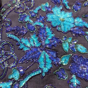 Hand Beaded and 100% silk exterior, different shades of blue, button front hidden, scalloped edges throughout and shoulder pads.