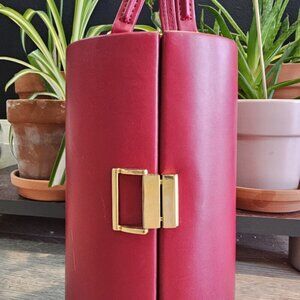 This is a vintage French travel jewelry case made from genuine leather, featuring a sophisticated and functional design. Standing 8 inches tall with a circumference of 5 inches across, it showcases a rich burgundy red exterior and elegant gold-toned clasps for a touch of luxury. The sturdy double handles provide practicality and charm, making it perfect for travel.