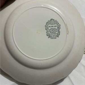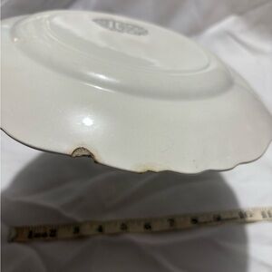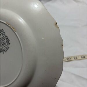 Decorative plate with a winter scene. Features snow-covered trees and houses.