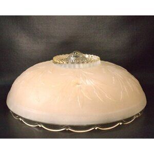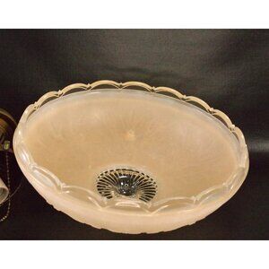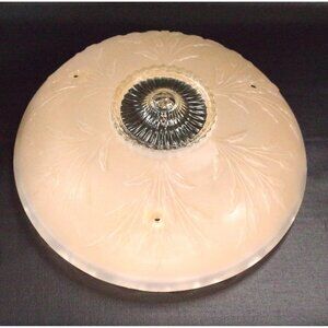 This is a lovely clear and pale pink frosted glass for a ceiling light fixture. There 3 holes in the glass for it to be secured to the fixture by chains. It has a scalloped edge, decorative relief of stylized leaves radiating from the central medallion, and is faceted to throw light further. The glass is particularly heavy and well made. It is about 10 1/2 inches across the widest points and is about 4 inches high.