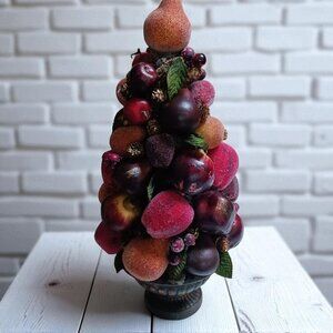 Add a touch of timeless charm to your holiday decor with this beautiful vintage fruit topiary centerpiece! Standing 14 inches tall, this classic arrangement features a variety of faux fruits, including apples, pears, pomegranates, and cherries, accented with natural-looking pinecones and nestled in a decorative metal pot.