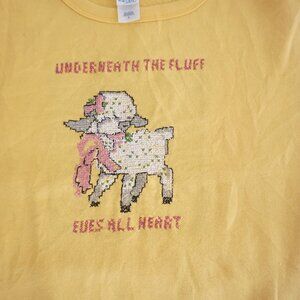 This Fruit of the Loom sweatshirt brings an irresistibly sweet, nostalgic charm with its darling stitched-style lamb graphic and the phrase “Underneath the fluff lies all heart.” The sunny yellow tone instantly brightens the mood, giving the whole piece a warm, cheerful personality that feels perfect for cozy days or playful weekend outfits. The slightly textured interior adds that familiar lived-in comfort that makes vintage sweatshirts so easy to reach for again and again.