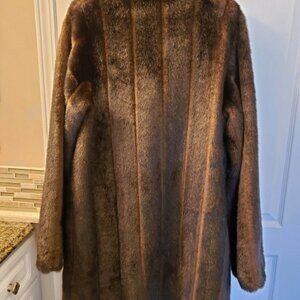 Beautiful Soft Brown Vintage Faux Fur Full Length Coat has soft luxurious satin lining. I believe it is a Faus Beaver however it is so soft and luxurious it is difficult to know. This lovely Women's coat is size L. Note: Coat has never been worn, but has no tags. Bust 44"; Waist 45"; Hip 50"; Arm Length from Shoulder: 30"; Arm width 16" ; The Length from shoulder is: 48" on long on the hanger. Item is kept in closet away from any cooking and with cedar scent bars throughout closet, dehumidity in home with non smokers.