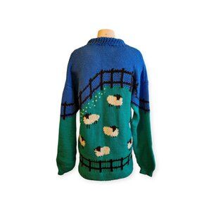This vintage cardigan features a unique pastoral sheep design, perfect for adding a charming touch to your wardrobe. Crafted from handknit materials, it fits sizes L to XL. It appears the previous owner may have put it into the dryer, or stretched it out in a weird way. It doesn't drape ideally. If this is going to be a problem for you, this is not the item for you. If worn unzipped, it would be a lot less noticable. Look carefully at the photos.