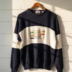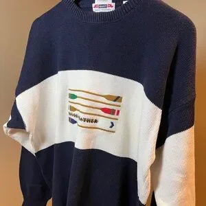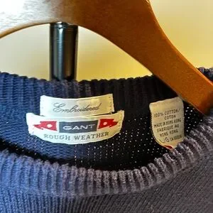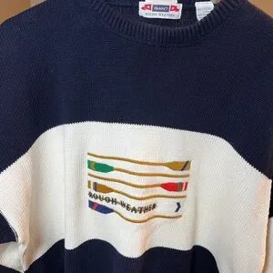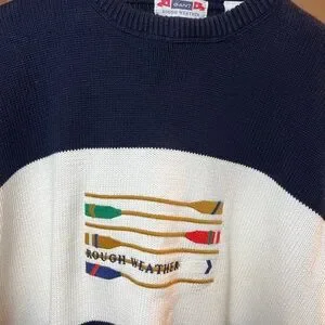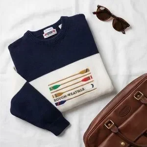 Classic Gant “Rough Weather” cotton knit sweater featuring bold nautical oar embroidery across the chest. Navy and cream color block design with ribbed collar, cuffs, and hem.