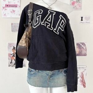 Sick reworked GAP sweatshirt with a trendy one-shoulder cut. Features the classic white embroidered GAP logo on a faded black base and a functional kangaroo pocket. Effortless street-style / grunge Y2K vibe.