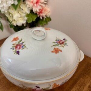 This stunning vintage porcelain tureen was made in the German Democratic Republic and features a delicate multicoloured floral motif with soft gold edging and elegant handles. With a generous 10-cup capacity and its matching lid with looped handle, it's the perfect blend of function and charm — ideal for a retro table or vintage china collection.