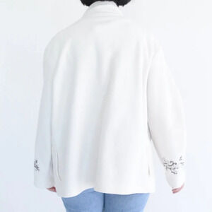Crafted with attention to detail, this sweater features delicate embroidered leaves in warm, earthy tones, evoking the beauty of a crisp fall day. The cream color adds a touch of sophistication, while the zip-up design provides versatility and ease of wear. Whether you're strolling through colorful foliage or enjoying a cozy evening by the fire, this sweater is sure to keep you stylish and snug.