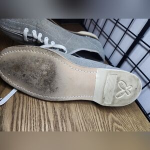 The shoes in the image are vintage Dynamic gray bowling shoes with laces, women's size 8 1/2. Bowling shoes are designed with slick soles to help bowlers slide smoothly during their approach. It is important to avoid wearing bowling shoes outside to keep the soles clean and maintain their functionality.