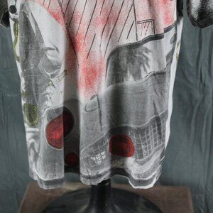 Up for sale is a vintage all over graphic t-shirt. It has a large graphic on the fornt and back of a man playing a saxaphone with a car beside him. What an amazing vintage shirt do not miss out on it.