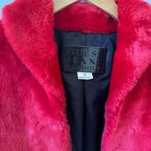 Add glamour to your outfit, with this fabulous vintage size medium GUESS faux fur jacket. This jacket was made in Italy and the luxe faux fur is in a vibrant red hue. This fully lined jacket has full length arms and has an open jacket style (with no closure snaps or buttons)