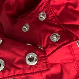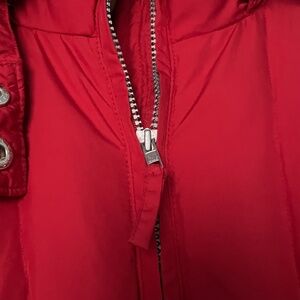 Vintage vibes from this Gap down jacket. Channel quilting and side cinch belt detail. Zip off hood with snap closure. Sleeves have elastic cuffs for warmth, fleece lined pockets. Size large. In excellent used condition. Fur trim is missing from hood.