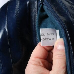 Gorgeous vintage (80's) genuine eel skin slouch shoulder bag/purse in navy blue with brass hardware. Fold over, double flap top with blue suede lining. Loads of compartments and most are zippered so your items are secure. Made in Korea. Approx. measurements: 5"W x 11"H x 12"L (strap = 37"). Pre-owned but in excellent condition. Smoke-free, pet friendly home!
