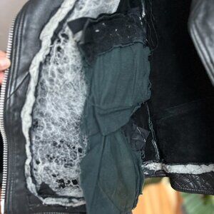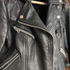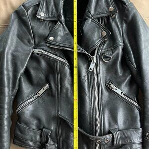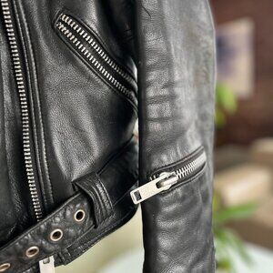Vintage genuine leather moto jacket featuring a classic asymmetrical zip, heavy silver-tone hardware, waist belt, and multiple zip pockets. Made from thick, high-quality leather that has softened beautifully over time while still maintaining its structure. The original interior liner has been removed, making the jacket lighter and more flexible to ride in. This piece has a true vintage fit and runs small by modern standards. I’m 5’2” and the sleeve length fits me perfectly; sleeves may feel short on longer arms, which is typical of vintage outerwear. Fits like an XS-S depending on layers.