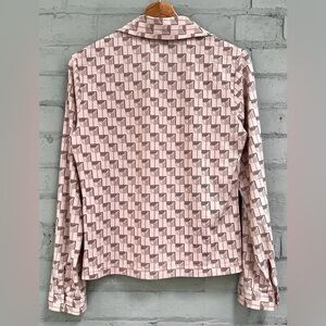 Fun 1970s polyester shirt with novelty geometric print. Popover style, wide collar. Long sleeve. Lightweight slinky polyester material has some stretch. Excellent vintage condition.