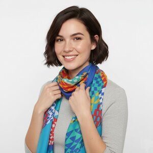 Unleash a kaleidoscope of colour with this stunning geometric print scarf. Featuring a vibrant, abstract pattern of interlocking blocks, diamonds, and triangles in a bold palette of electric blue, sunny yellow, emerald green, fiery red, and crisp white, this scarf is a true statement piece.