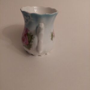Vintage porcelain shaving cup or scuttle mug. White porcelain with hand-painted floral design on the side. Approx 3.75" tall. Logo: Three Crowns China, Germany. (1909-1916)