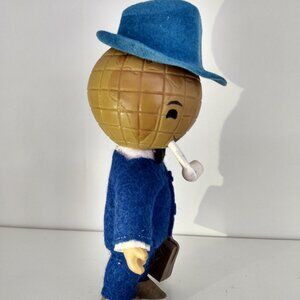 Good used vintage condition with some wear from age and handling. The sticker on the briefcase is coming loose. The elastic thread that holds the hat to the head is worn. A few marks here and there as well.