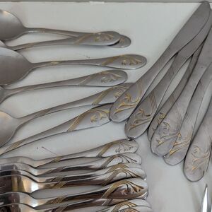 Mixed set of vintage German flatware marked “Edelstahl Rostfrei 18/10” by Amil. Includes various pieces with potential gold accents and classic designs. Ideal for collectors, replacements, or adding a touch of vintage charm to your table. Please refer to photos for specific pieces included. Light wear consistent with age.