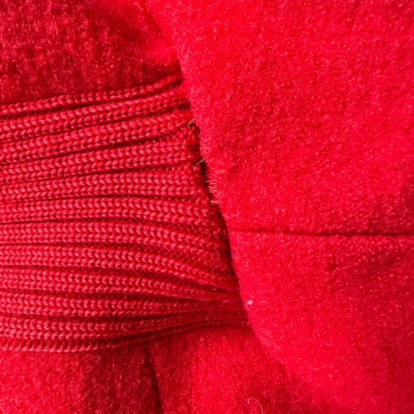 This is a vintage crimson red boiled wool jacket from Giesswein. It's in very good vintage condition. The bottom button is missing. There is a repair on the seam under the right arm that is not visible when the jacket is on. The price reflects these two defects. Knit fabric along sizes allows the jacket to have some stretch for arm movement while still looking crisp. This would be a great office-appropriate option for a woman who's always chilly, as this jacket is very warm. Fits like a US 10.