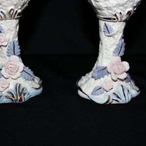 Pair of lovely decorative vases in the shape of a chalice. The pastel blues, pinks, and lavenders complement each other beautifully. The rims, bases, and handles are also scalloped. They would make for a lovely decor accent in your home.