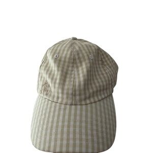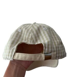 Lightweight and breathable beige with some green gingham baseball cap featuring a charming embroidered vintage bicycle on the front. The seersucker-style fabric gives it a classic, casual feel—perfect for sunny days, cottagecore looks, or adding retro charm to your outfit.