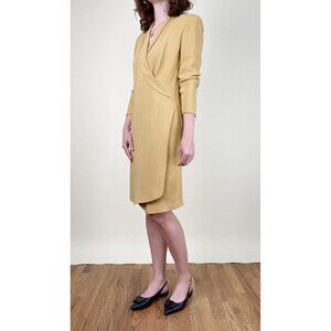Step into timeless elegance with this exquisite vintage Giorgio Armani blazer dress, meticulously crafted in Italy during the late 1980s or early 1990s. This power-dressing essential boasts a chic wrap silhouette, sharp tailoring, crepe material, and a sophisticated golden yellow hue, embodying classic Italian luxury. Perfect for making a statement at the office or an evening event, this rare piece offers unparalleled style and quality for the discerning vintage collector