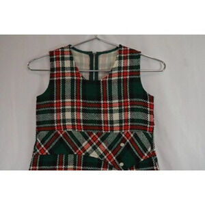 Adorable little girl's shift style dress from the 1960s. Sleeveless, faux belt at waist with button detail, zips up the back. Red and green plaid fabric that feels like some kind of wool blend but is fairly lightweight. Minor piling. Suitable for a young child, probably 4 years old?
