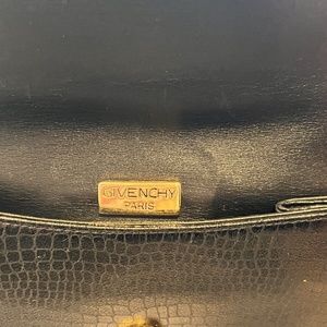 Givenchy metal logo on front snap closure and metal Givenchy Paris plate on inside.