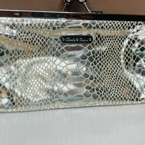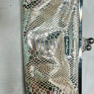 Step into elegance with our stunning vintage silver handbag by Claudia Canova, now available online! This classic piece is in excellent condition, featuring a dark pink interior lining and a luxurious design that mimics python skin.
