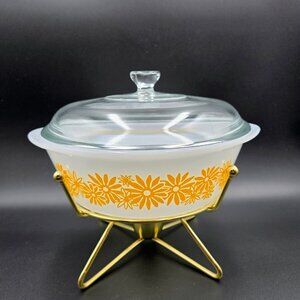Vintage Glasbake Ovenware Yellow Daisy Casserole 514 Lid Brass Warming Stand Lid
