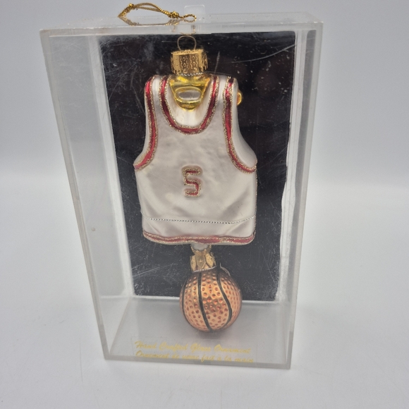 Decorative basketball jersey ornament in white and red. Features a basketball design.