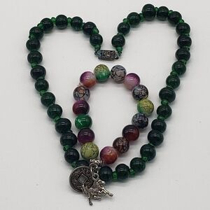 -Pretty dark green glass beaded choker necklace accented by a lovely multicoloured stretchy glass beaded bracelet with 2 silver tone charms - Zodiac Taurus bull and Chinese coin ideal for small wrists only; together they make a beautiful set