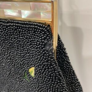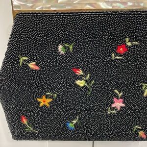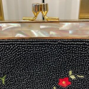Stunning vintage glass beaded handbag with embroidered multicoloured flower pattern, gold toned hardware, kiss lock closure and short handle chain. Mother of Pearl detail on the frame of the bag, satin lined interior with smaller pockets inside. Very good vintage condition. There is no interior tag but is believed to be hand embroidered/hand beaded and made in Hong Kong. Some discolouration to the hardware/kiss lock, there is one small area with a few beads missing. These things do not take away from the quality of this bag. Incredibly unique and you will not find another stunner like this one! Please see photos, measurements are for reference only, reasonable offers welcome!