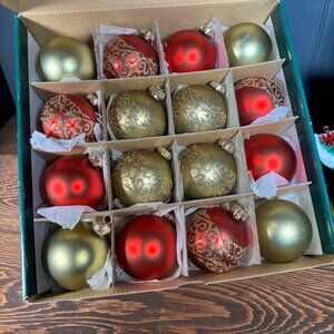Large 16-piece set: box shows general shelf wear but is intact; ornaments are in good vintage condition with no chips or cracks noted.