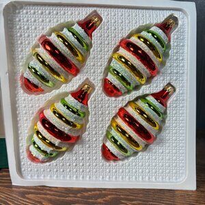 Striped pine cone set: mild box wear consistent with age; ornaments appear in excellent condition.